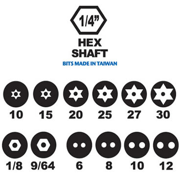 Tamperproof Bit TypesSpanner: 6, 8, 10, 12, Hex-Pin: 1/8, 9/64 , TORX-Pin: 10, 15, 20, 25, 27, 30